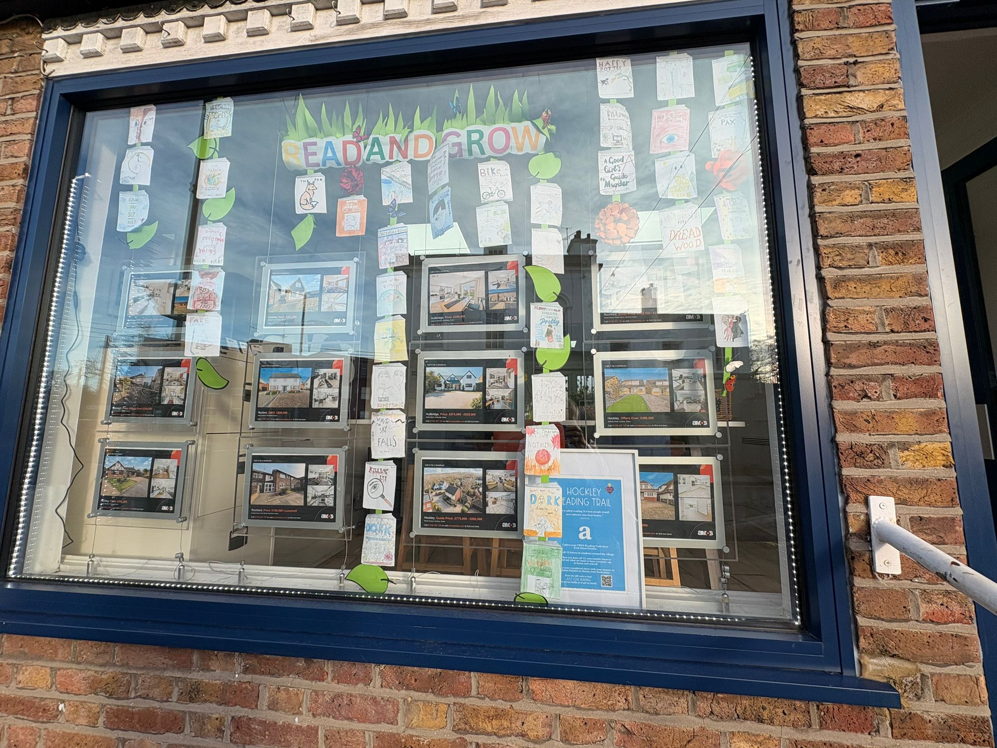 Our front window at Amos Estates in Hockley is looking beautifully bright this morning thanks to the talented pupils at Lift Greensward School, whose wonderful ‘Celebration of Reading’ project is bringing a real splash of colour to Spa Road, Hockley in the run up to World Book Day on 5th March.